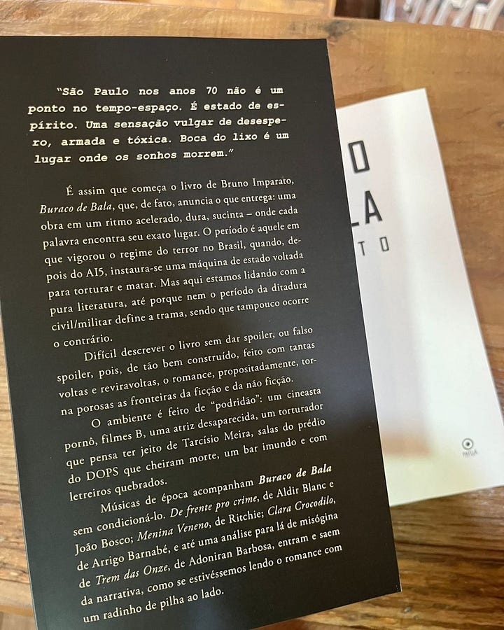 Então, repito, mais uma vez: Semana que vem, no dia 19/02 (quinta-feira), às 19h30, meu amigo e irmão Bruno Imparato lançará seu primeiro romance, BURACO DE BALA. O lançamento será na LIVRARIA PATUSCADA (Rua Luís Murat, 40).